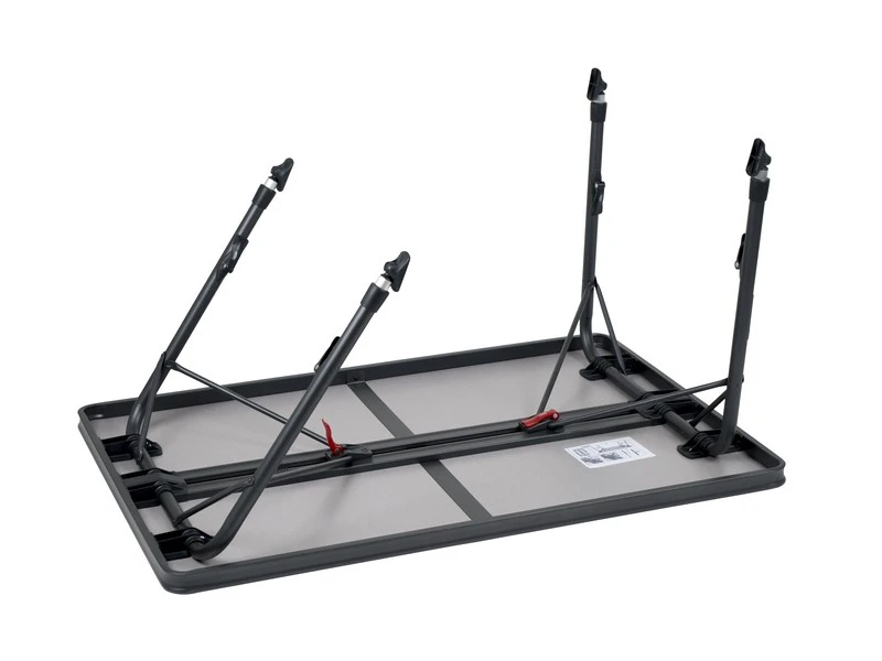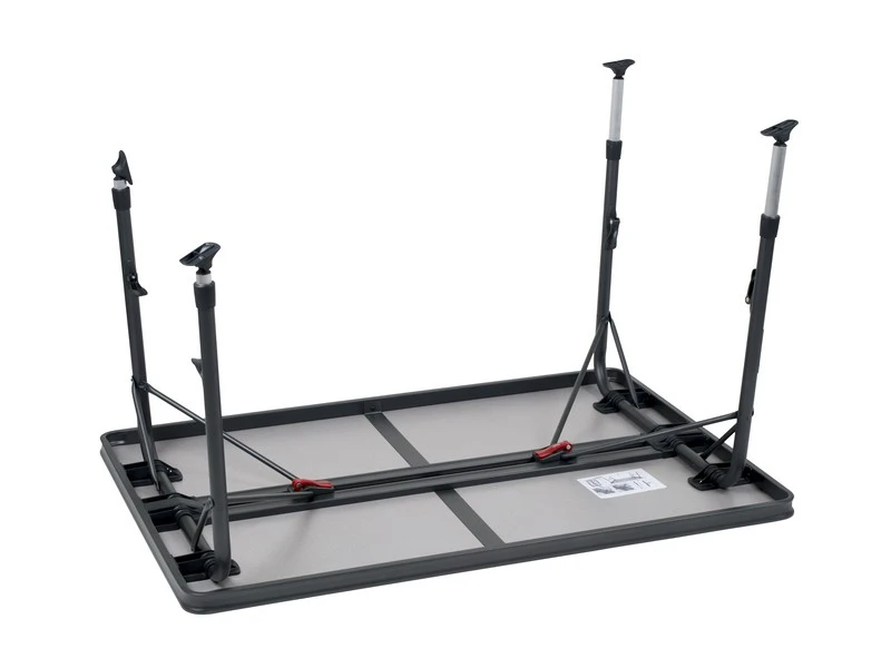 Een zeer stabiele tafel van hoge kwaliteit. Dankzij de speciale constructie is deze tafel eenvoudig in- en uit te klappen. Daarnaast zijn de poten na het inklappen stevig te bevestigen in de geleide aluminium rails aan de onderzijde van het tafelblad. Het tafelblad is extra ruim zodat deze plaats biedt tot 6 personen. De aluminium rails aan de onderzijde van deze campingtafel zorgt eveneens voor extra versteviging. De hoogwaardige materialen en het hittebestendige en watervaste tafelblad zorgen voor een lange levensduur. De poten bieden een hoge stabilteit door de dikke (28 mm) en extra verstevigde buizen. De stabilisatie voetjes zorgen voor extra grip op iedere ondergrond. Deze tafel is licht van gewicht door het aluminium frame.