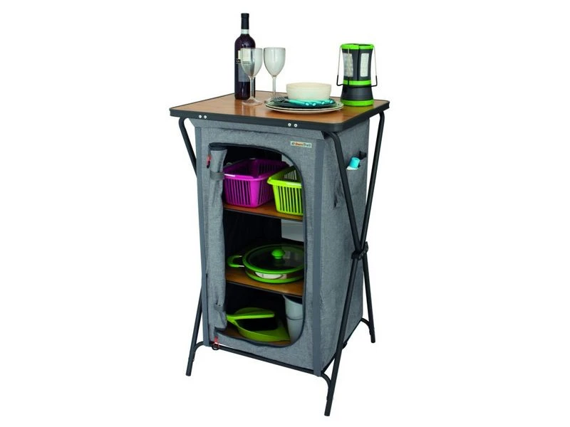 Populaire campingkast, snel op te zetten en met veel opberg plek. 3 etages om al uw keuken of kleding in op te bergen. De Nova Lucera is vervaardigd van het gemêleerd polyester wordt geleverd incl. topblad en stevige etage planken van bamboe materiaal. Verstelbare poten om de kast goed stabiel neer te kunnen zetten. Incl stevige draagtas.